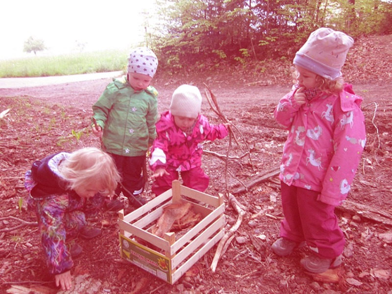 Die Tatsache, dass hauptsächlich Naturmaterialien zum Spielen zur Verfügung stehen, führt dazu, dass bei den Kindern Kreativität und Fantasie gefördert werden. Da wird ein Ast heute zu einem Kochlöffel, um in der gekochten Waldsuppe zu rühren, morgen eine Angel, mit der Fische gefangen werden und übermorgen eine Säge für den Waldarbeiter.