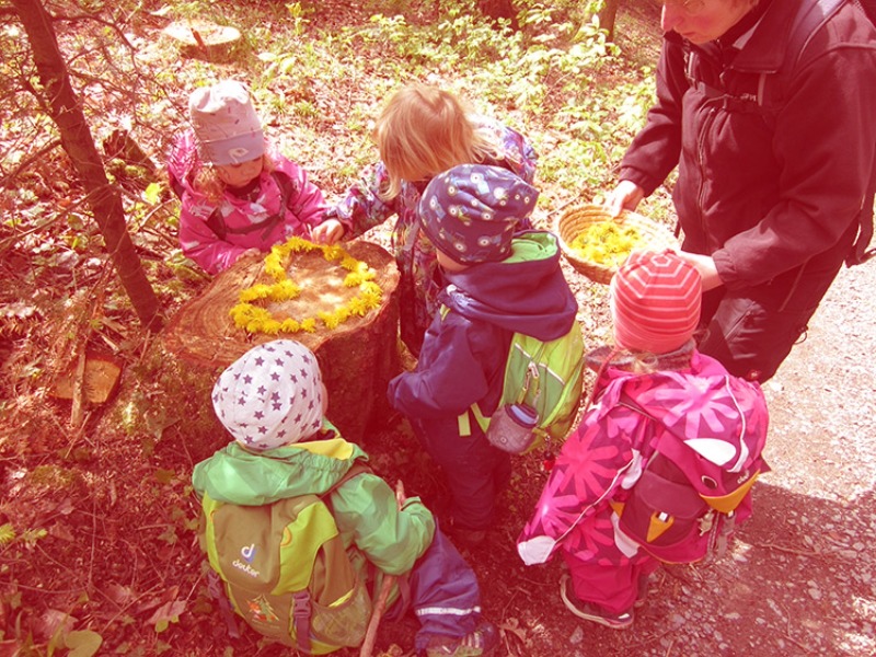 Im Jahreskreislauf der Natur begegnen die Kinder einer bunten Vielfalt an Möglichkeiten zur Sinneserfahrung; z.B. Wie riecht der Frühling? Wie fühlt sich der Regen auf unserer Haut an? Wie schmecken Wiesenkräuter? Wie klingt der Wind?